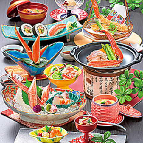 ●茹でがに●小鉢二種●かにサラダ●かに刺身●ずわい陶板ステーキ●かに茶碗蒸し●たらば焼き●かに天ぷら●寿司●お椀●デザート ご友人とのお食事・ご親族のお集りにはもちろん、会食・接待といったビジネスシーンにもおすすめです。※詳細はコースページをご確認ください。
