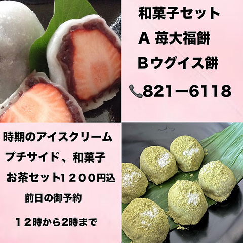 和菓子セット ウグイス餅、苺大福餅の2種類。12時から2時迄