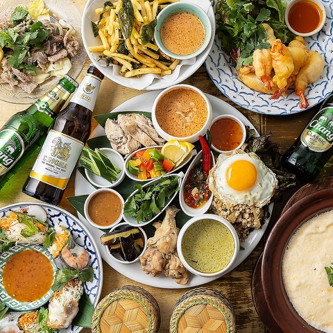 ◆生春巻き◆ポテトフライ レッドカレーソース◆牛肉のラープ◆ふわふわ玉子のトムヤムスープ◆クンチュップペン・トート(タイ風えびのフリット)◆〆のご褒美プレート(グリンカレー&チキンライス&ガパオライス)+1,650円で飲み放題がつけれます!