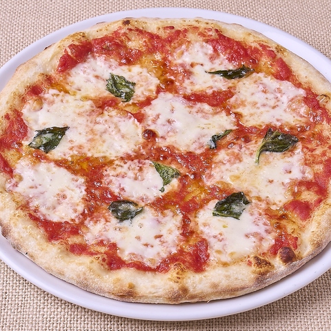 厚めに仕上げた生地に、特製ピザソースを塗り、モッツァッレラチーズを散らして焼き上げ、バジリコを散らしたピッツァ。その昔、ナポリを訪れたマルゲリータ王妃に捧げたピッツァがその名前の由来とされており、トリコロール(3色)国旗に見立てられるイタリアンピッツァの代表格。