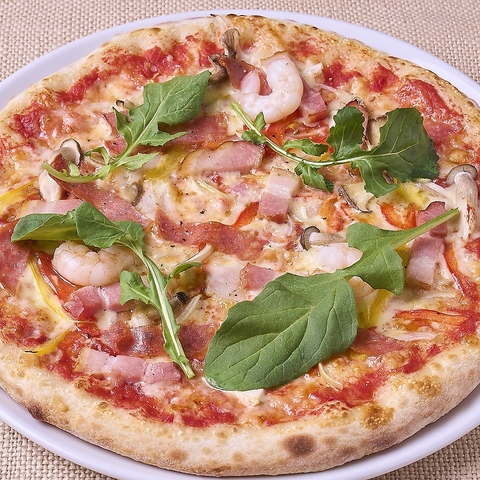 厚めに仕上げた生地に、特製ピザソースを塗り、サラミ,ベーコン,オニオン,海老,キノコ,日替わりトッピングなど具だくさんのトッピングを散りばめて焼き上げたミックスピッツァ。仕上げにエクストラヴァージンオイル、イタリアンパセリ、香り良い黒胡椒を挽いて提供します。