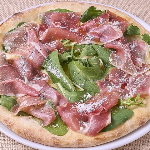 厚めに仕上げた生地にチーズだけをトッピングして香ばしく焼き上げ、仕上げにルッコラと生ハムをのせて仕上げにパルミジャーノ レッジャーノ、挽き胡椒を散らして提供します。ピッツァの生地と、熟成した生ハムの旨みとの相性が抜群の逸品です。