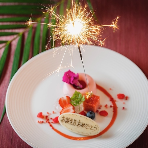 お誕生日などの記念日のご利用にはオプション商品の「アニバーサリープレート(※前日までの要予約)」メッセージ入りのパティシエ特製デザートプレート(花火付き)がおすすめ。仲良しグループや大切な方と特別なひとときをお過ごしください。