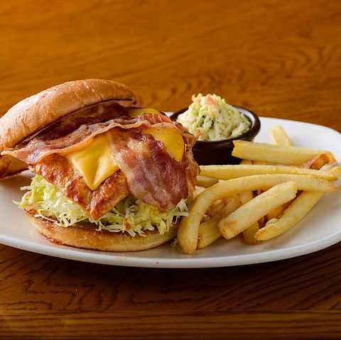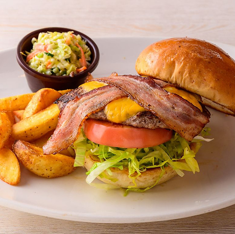 フライドポテトとコールスロー付き!ベーコンとチーズとトッピングした、人気No.1のハンバーガー。