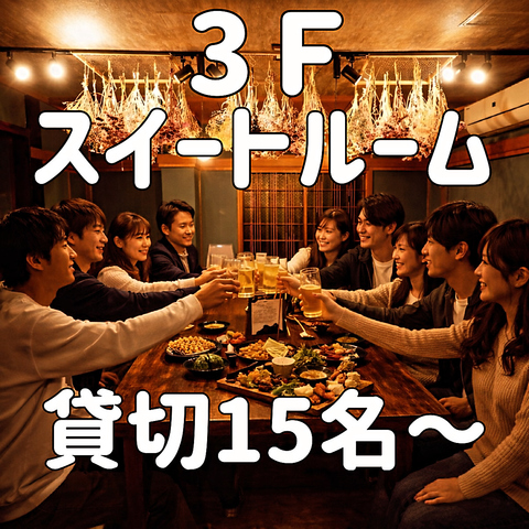 【2階個室貸切は15名様~最大28名様まで】【3階個室貸切は2名様~最大20名様まで】女子会、デート、お祝い、宴会など様々なシーンでお使いいただけます♪3階個室はスタッフが来ないセルフ飲み放題となっており、普通の個室よりもさらにプライベート感満載のお部屋です。インテリアのドライフラワーに癒されます。