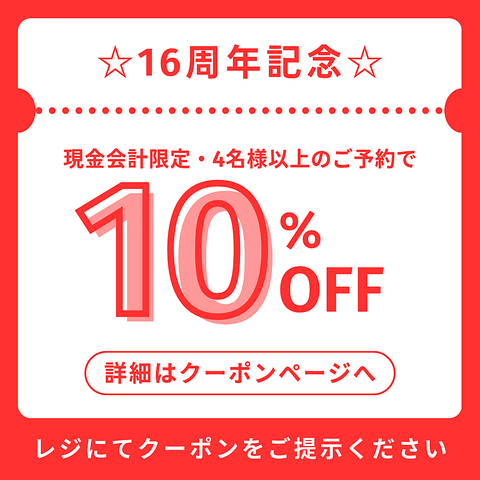 おかげ様で16周年♪【現金会計限定】4人以上のご予約でお会計から10%引き!