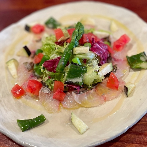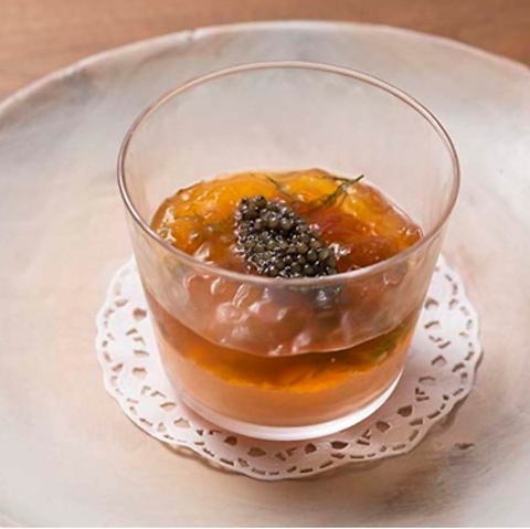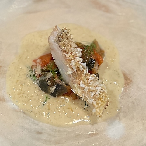 オープン以来の人気メニュー。京都では、「グジ」とも呼ばれる赤甘鯛は、上品な甘みと旨味が特徴で、京料理の最高級食材として重宝されてます。鱗も食べることができ、鱗を落とさずに焼く鱗焼きという調理法もありフレンチでは、鱗に高温の油をかけることで鱗が逆立ち、パリパリとした食感を楽しむこともできます。