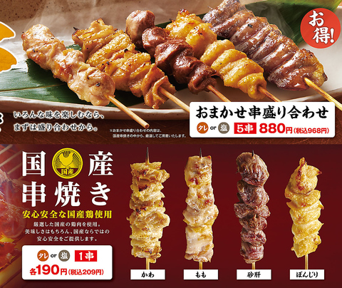 村さ来のオススメは新鮮魚介だけじゃない!熟練の職人が一本一本じっくりと丁寧に焼き上げるこだわりの串焼きも大人気です☆串焼き盛り合わせも御座いますので絶品串焼きがリーズナブルにお楽しみ頂けます♪