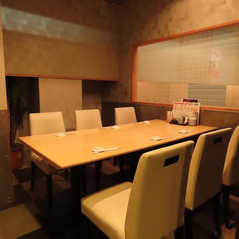 半透明の仕切りが柔らかく視線をさえぎり、ほどよいプライベート感を生み出す個室♪ 明るいトーンのチェアとテーブルが清潔感を添え、落ち着いて過ごせる雰囲気です。少人数の集まりにも使いやすく、会話も食事もゆったり楽しめる心地よい一室◎ 家族でも友人同士でも気軽に利用しやすい、便利で快適な個室です。
