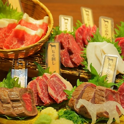 ロース・ふたえご・たてがみなど、厳選された馬刺しは濃厚な味わい&ヘルシーでおすすめです!馬肉は、熊本直送で仕入れた新鮮な馬刺しを使用しております。赤身の旨味がギュッと詰まっています。新鮮なお肉は、口の中でとろけるような食感が特徴の、女性のお客様にも人気です。お刺身はもちろん、お酒のおつまみとしてもお楽しみいただけます。