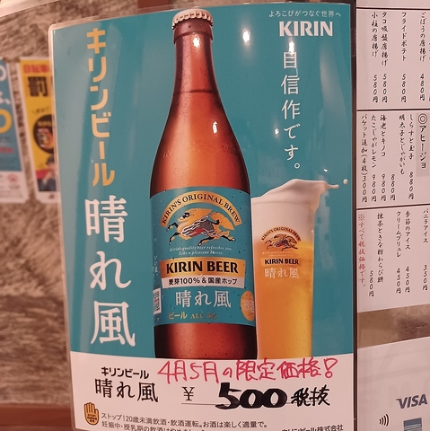 ★4月、5月限定価格★キリン晴れ風中瓶1本<税抜>500円でご提供!