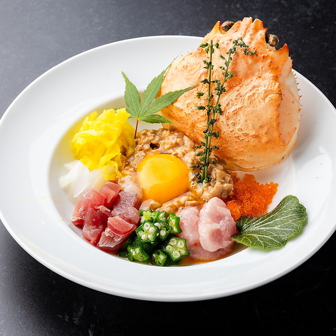 新鮮な海鮮と薬味をたっぷり詰め込んだ“ばくだん”を蟹の甲羅に。豪快かつ華やかな海の宝箱です。