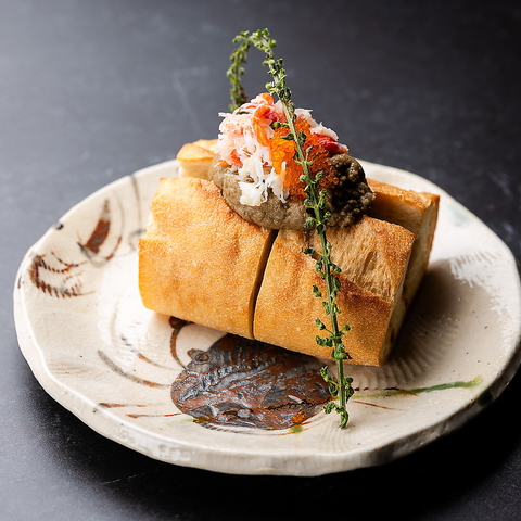 カリッと香ばしく焼き上げたバゲットの上に、濃厚な蟹味噌をたっぷりと。ワインのお供にも最適な、まさにごちそうと呼ぶにふさわしい一品です。