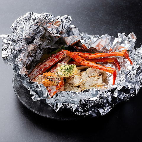 プリプリのたらば蟹の身を、風味豊かなバターと共にホイルで包み、じっくりと火を通しました。ホイルを開けた瞬間に立ち上る、バターと蟹の香ばしい香りが食欲をそそります。