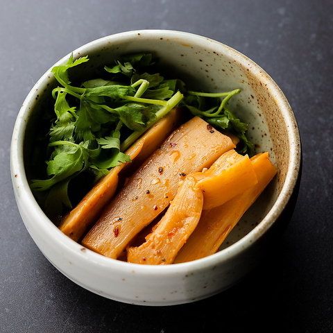 シャキシャキのメンマを、フレッシュなパクチーと特製のタレで和えました。パクチー好きにはたまらない、やみつきになるおつまみです。