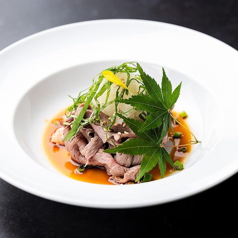 上質な国産和牛の赤身を、さっと炙ってカルパッチョに。肉の旨みを、香味野菜とさっぱりとしたおろしポン酢が一層引き立てます。