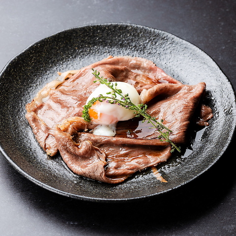 和牛の表面を香ばしく炙り、特製のタレでユッケ風に。とろりとした温泉玉子を崩して絡めれば、肉の旨みとタレの甘み、黄身のコクが一体となります。まさに極みと呼ぶにふさわしい、贅沢な逸品です。