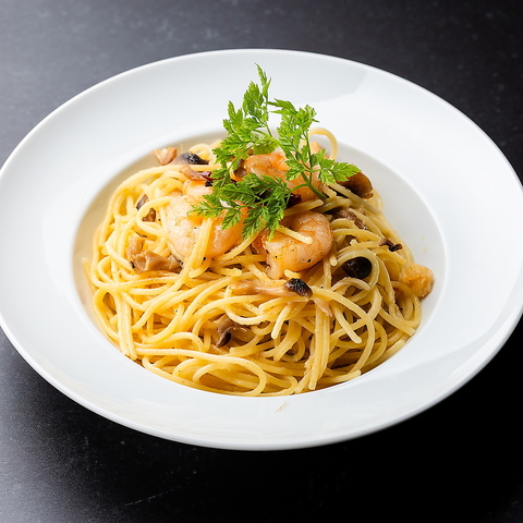 蟹と海老、2つの海の幸の旨みを、ガーリックオイルが最大限に引き出した香り高い一皿。食欲をそそる香りがたまらない、本格ペペロンチーノです。
