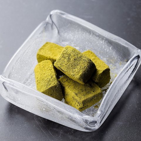 もっちり、ぷるぷるとした独特の食感のわらび餅に、香り高い抹茶をたっぷりとまぶしました。和の心を感じる、癒やしの甘味です。