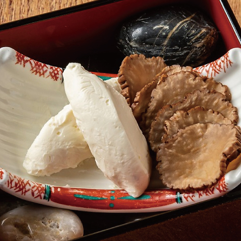 秋田の漬物『いぶりがっこ』のスモーキーな風味と食感、クリームチーズの甘味と酸味が合わさった、癖になるお料理です。