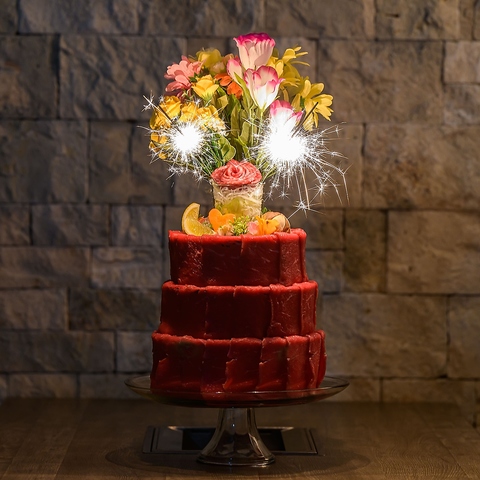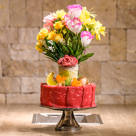 肉ケーキ・肉ブーケはご希望にあわせてメッセージプレートや、サプライズ演出もご対応可能!詳細は「料理」欄をご確認ください。※事前の電話ご予約必須