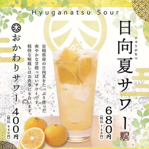 宮崎県産の日向夏をたっぷり使った爽やかな甘酸っぱいサワーです。軽快な喉越しはお食事にも合います。※「おかわりサワー」は440円(税込)です。