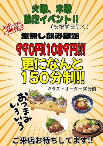 生ビール無し飲み放題が990円(税込み1089円)♪しかも150分☆彡