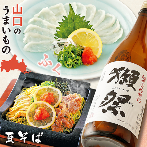 本場で食べる『ふく刺し』は上品な味ときめ細やかな食感が贅沢な一品。名物『瓦そば』は熱々の瓦の上でパリパリになった麺のおこげがたまらない!レモンと紅葉おろしで味変するのがオススメの食べ方です◎また飲みやすく、幅広い味わいを楽しめる獺祭など『山口地酒』を多数ご用意!お好みの肴と地酒を組み合わせてみては♪