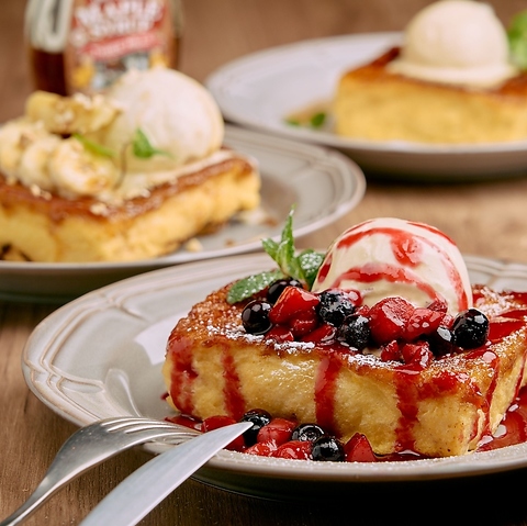 とろける食感のブリュレフレンチトースト!さらにトッピングで贅沢なミックスベリーフレンチトースト、キャラメルバナナフレンチトーストとプレーンを合わせて3種類!ハーフサイズもあるので食後にも食事にもなるフレンチトーストです