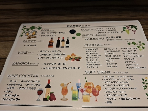 キリン一番搾り、樽詰めスパークリングワイン、自家製サングリア等70種類が飲み放題です。ノンアルコールカクテルも充実してますのでどなたにも楽しんでもらえる飲み放題です!