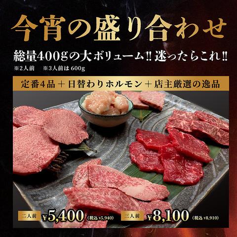 人気の定番部位から希少な厳選部位まで一挙に楽しめる「今宵の盛合せ」は当店自慢の人気メニューです
