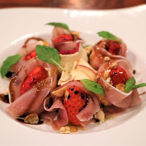 コンポーートした苺とサワークリーム、それを生ハムで巻いたワインや甘口タイプの日本酒と好相性なサラダです。