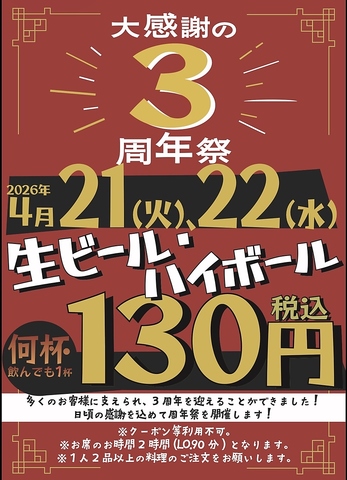 ハイボール・生ビールが何杯飲んでも1杯130円(税込)!
