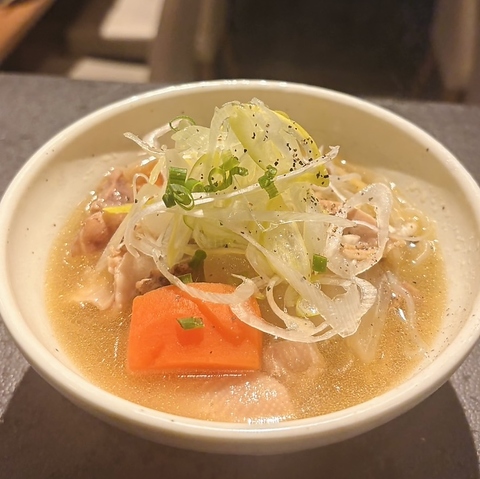 鶏肉、モツ、鶏皮等を生姜を効かせたスープでコトコト、、、温まる一品です、どうぞ。