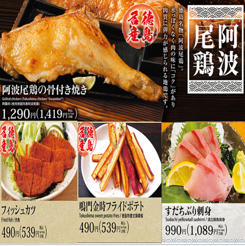 阿波尾鶏の骨付鳥1,290円(税込1,419円)フィッシュカツ490円(税込539円)鳴門金時フライドポテト490円(税込539円)徳島れんこん天ぷら490円(税込539円)