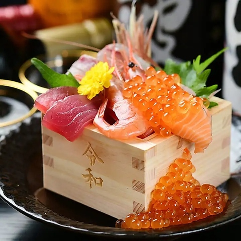 三河湾や伊勢湾など、その日・その季節の良いものだけを使う旬の魚介類。料理人が市場にて毎朝目利きする、鮮度と味は名物級の刺身3種盛りです。こちらは令和の時代にも愛されるお店を目指し、祝枡でご提供。いくらをドバッっとぶっかけた豪快で彩り鮮やかな盛り付けは、見た目にも楽しめるご注文必須の人気メニューです。
