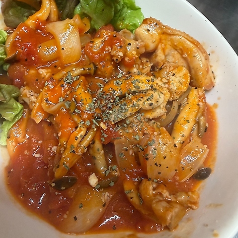 トマトの酸味が爽やかに味わえるトマトソースは、きのこの素材の旨味に相性バッチリです♪チキンの食べ応えのある食感で満足感がある【チキンのトマトソース煮込み】は900円とリーズナブルな価格でのご用意なので、コスパも良い◎追加トッピングでオリジナリティあるカスタマイズもおススメです☆