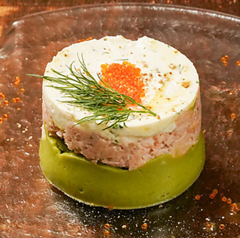 女子会におすすめ!三層全て味付けが異なりディルとわさびマヨが相性抜群のサーモンとアボカドのタルタル。