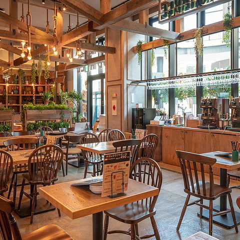 【ウッド調のおしゃれな空間】木の温もりを感じる広々とした空間は、グループ利用からご家族でのお食事まで幅広く対応。レイアウト自由なテーブル席や、プライベート感のある個室、ペット同伴OKの開放的なテラス席(5月~9月限定)も利用可能です。貸切も対応しており、地域・PTAの懇親会など様々なシーンにおすすめです。