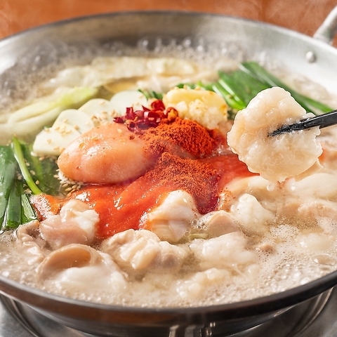 人気名物の明太もつ鍋は、ピリ辛の明太子とぷるぷるのもつが絶妙に絡み合う自慢の逸品!バターの香ばしい風味と、明太子の旨味がたまらない本格派の博多明太もつ鍋を是非ご堪能ください!