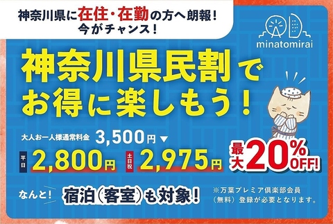 神奈川県在住の皆様に感謝の気持ちを込めて特別なご優待をご用意しました。【対象】神奈川県在住の方※公的証明書(運転免許証・保険証等)のご提示が必要です。【通常入館料】大人1名様 3,500円【優待内容】・平日:20%割引 → 2,800円・土日祝:15%割引 → 2,975円・小学生:1,800円 → 1,700円※万葉プレミア倶楽部会員(無料)登録が必要