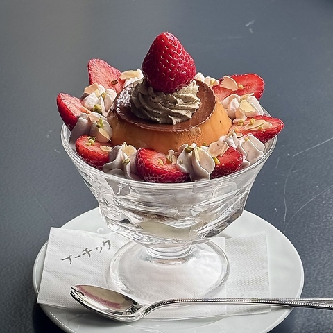 国産苺とBOOCHiC自慢のプリンに特製苺クリーム、芦屋Uf-fuさんの茶葉を使用したアールグレイクリームに苺ソース、バニラアイス、カスタードクリーム、イタリアBABBI社の高級ピスタチオペーストを使用したピスタチオムースなどパフェのようなプリンアラモードです