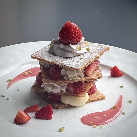 国産苺とサクッと薄く焼き上げたパイ生地の間には芦屋Uf-fuさんの茶葉を使用したアールグレイクリームに苺ソース、特製苺クリーム、カスタードクリームなど層ごとに楽しんでいただけるミルフィーユです