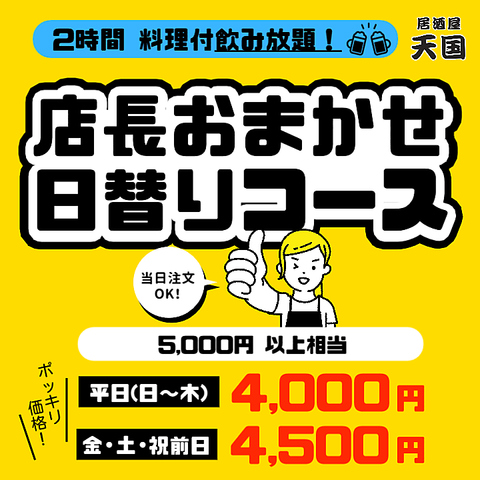 コースの料理はその日仕入れた食材等で調理します。その為、日替りで料理内容がかわるので料理は全て『店長おまかせ』でご用意。2時間飲み放題付で料理全10品~15品の通常5,000円以上相当のおトクなコースです![コース料金]◎平日(日~木)/4,000円(税込)◎金・土・祝前日/4,500円(税込)