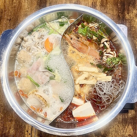 唐辛子や花椒・生姜をベースにしたビリ辛の麻辣スープ 鶏ガラスープにクコの実やキクラゲの入った白湯スープ 二色に仕切られた特製鍋で夏でも冬でも楽しめる中国鍋です。 ※要コース予約・4~8人前