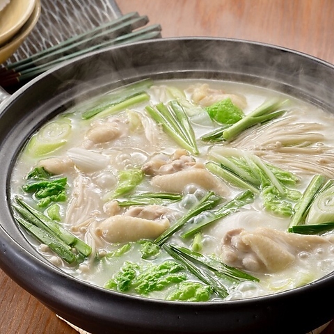 鳥取県産「大山どり」と宮崎県産「霧島黒豚」を使用した 贅沢なお鍋、出汁は生姜醤を加えた特製鶏ガラ白湯スープで あっさりお召し上がり頂きます。 ※要コース予約・4人前~