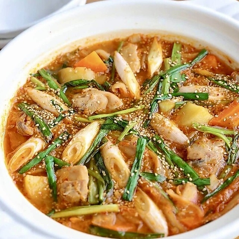 鳥取県産「大山どり」と宮崎県産「霧島黒豚」を使用した 贅沢なお鍋、チゲ味噌を使用したヒリ辛スープでどうぞ。 ※要コース予約・4人前~