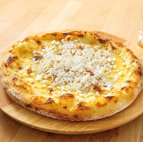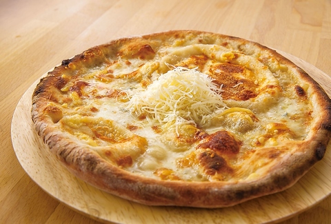 モッツァレラチーズ、ゴルゴンゾーラチーズ、ラクレットチーズ、パルメザンチーズの4種のチーズを使ったチーズ好きにはたまらないピザです。