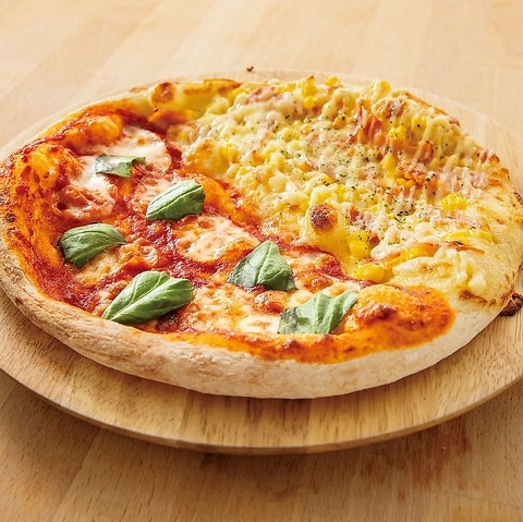 トマトとチーズの王道マルゲリータと甘みが広がるベーコンコーンマヨピザの2種類楽しめるピザです。