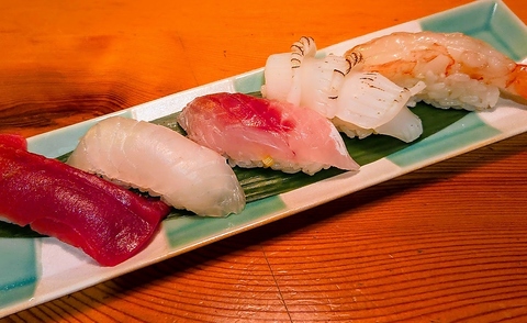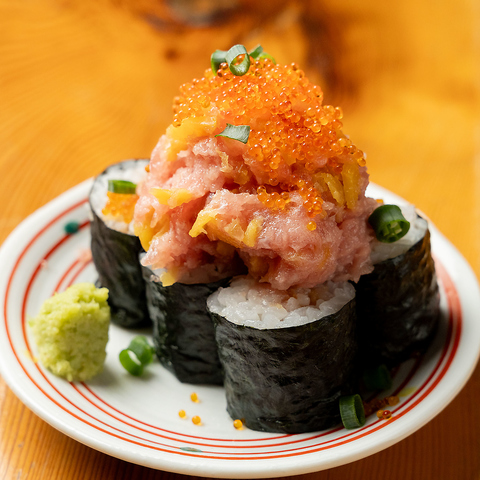 毎朝、店主が自ら市場に足を運び、その日一番の新鮮な魚を厳選して仕入れています。そんな海鮮にこだわり抜いた店主が完成させた極上の一品。いくらのプチプチ楽しい食感と程よく脂がのったサーモンのハーモニー口いっぱいに広がる贅沢なお寿司は、食べた瞬間にその旨味が広がり、日本酒との相性も抜群。
